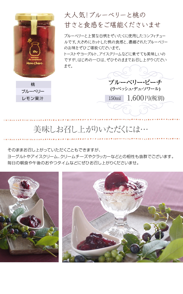 まるで夕暮れの中で白く浮き上がる桃の実のような、おもむきのある色合いになっています。長野産の新鮮なブルーベリーと和歌山・長野・山梨の白桃の香りがまじりあい、モンシェリらしいコンビネーションをお楽しみいただけます。
