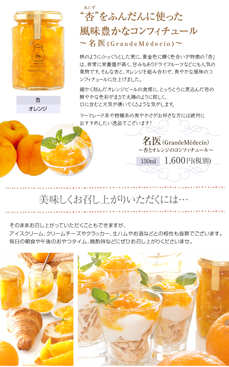 そんな杏と、オレンジを組み合わせ、爽やかな風味のコンフィチュールに仕上げました。