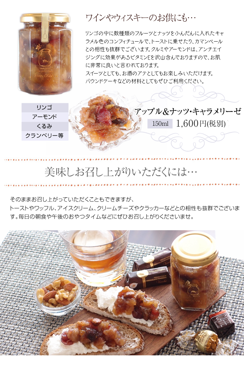 ベースの青森産リンゴ2種の中にフルーツとナッツをふんだんに入れた、キャラメル色のコンフィチュールでございます。クルミやアーモンドは、アンチエイジングに効果があるビタミンEを沢山含んでおりますので、お肌に非常に良いと言われております。トーストに乗せたり、カマンベールチーズとの相性も抜群でございます。スイーツとして、お酒のアテとしてもお楽しみいただけます。