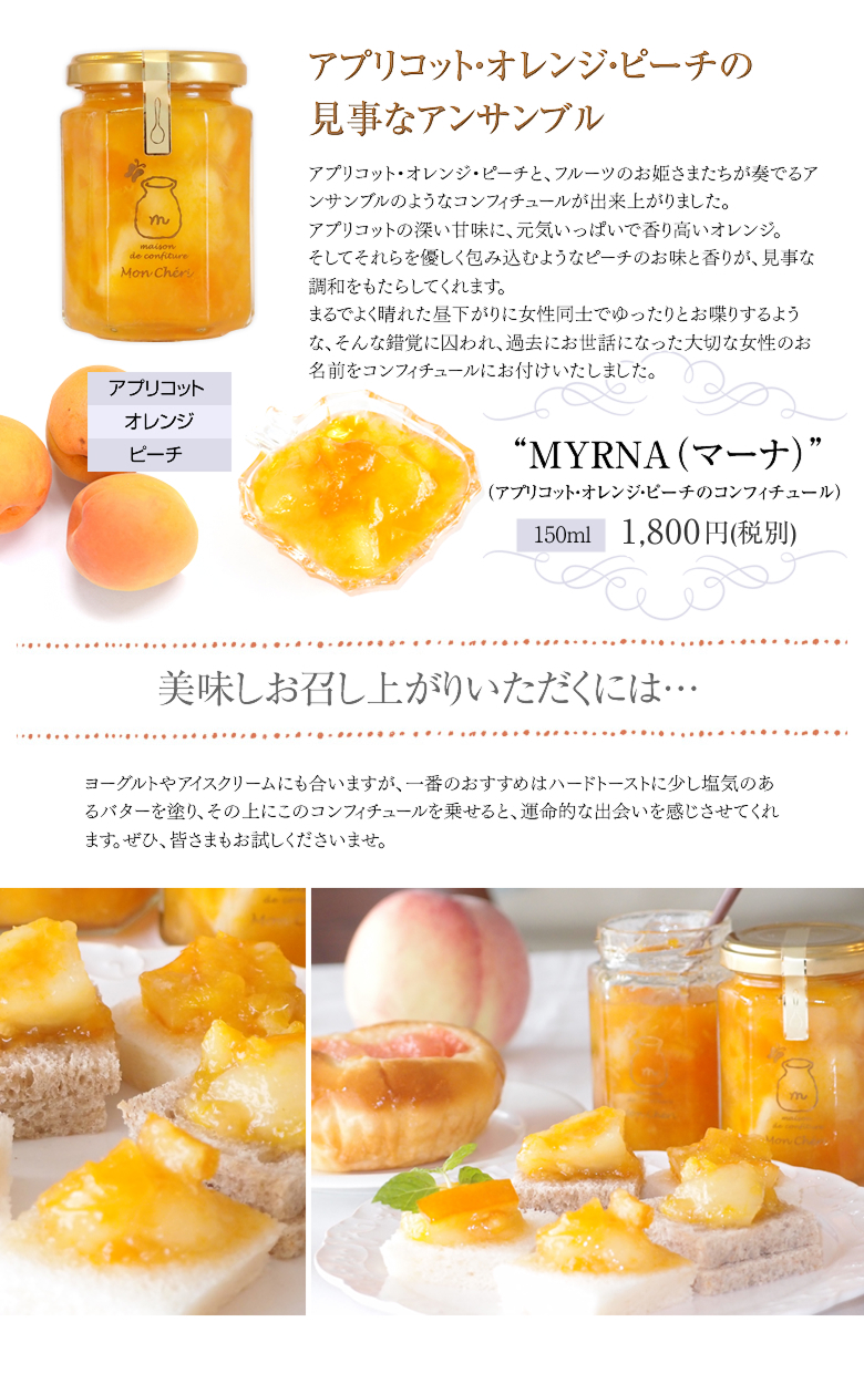 まるでよく晴れた昼下がりに女性同士でゆったりとお喋りするような、そんな錯覚に囚われ、過去にお世話になった大切な女性のお名前をコンフィチュールにお付けいたしました。