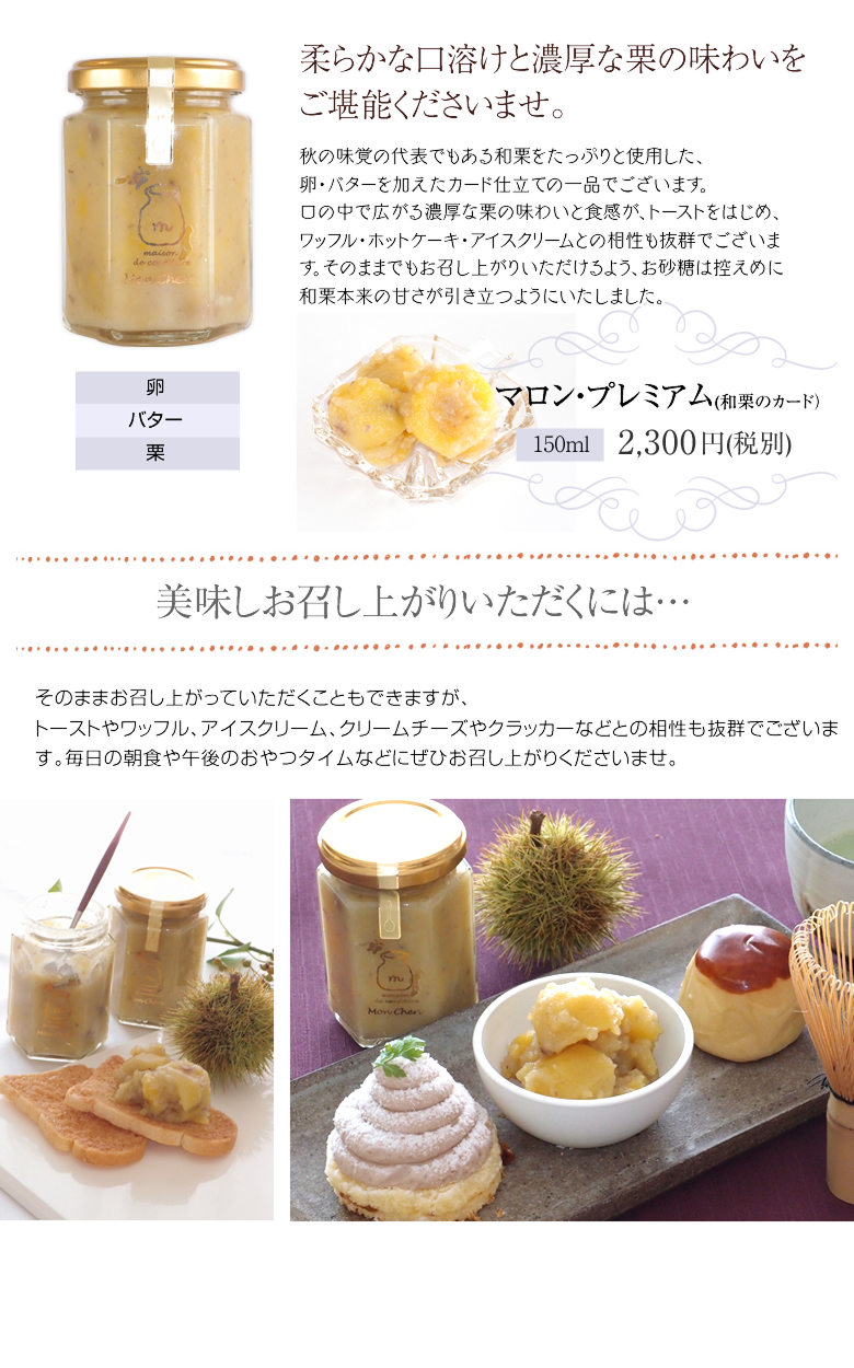 | 原材料 | 和栗、バター、卵、ブランデー、ビート糖 |
