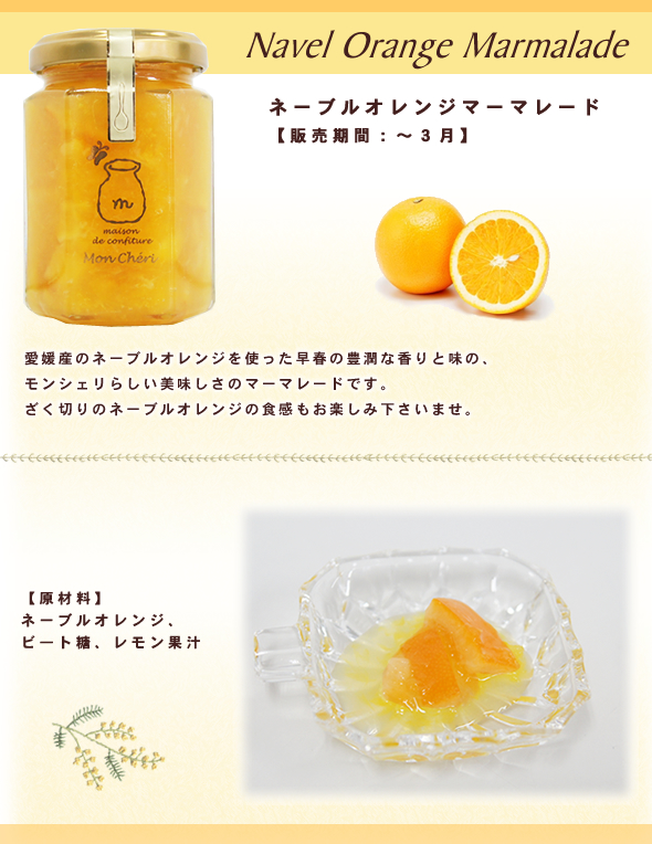 愛媛産のネーブルオレンジで作ったマーマレ―ドです。ザク切りのネーブルの食感と早春の香りをお楽しみ下さいませ。