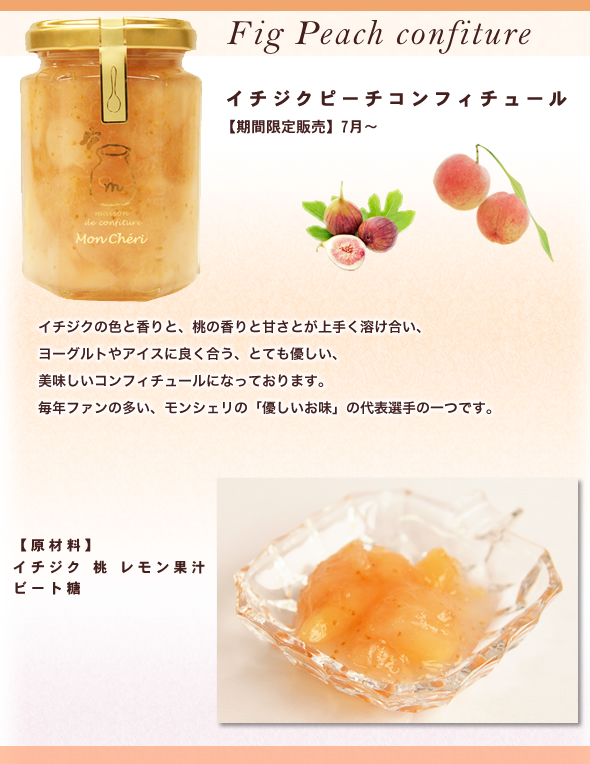 イチジクの色と香りと、桃の香りと甘さとが上手く溶け合い、とても優しい美味しいコンフィチュールになっております。モンシェリの「優しいお味」の代表選手の一つです。クリームチーズやヨーグルトやアイスクリーム、クラッカー、パンにつけてお召し上がりください。