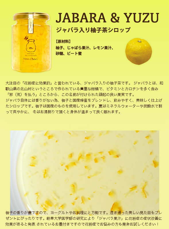| 原材料 | 柚子、じゃばら果実、蜂蜜、ビート糖、レモン果汁 |