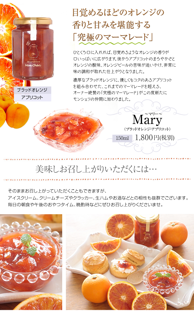 実は生食としても非常に濃厚なお味のため、柑橘系がお好きな方にはぜひおすすめしたいフルーツでございます。そんなオレンジと相性が非常に良いアプリコットを組み合わせた、これまでのマーマレードを超える、オーナー絶賛の「究極のマーマレード」がこの度新たに
