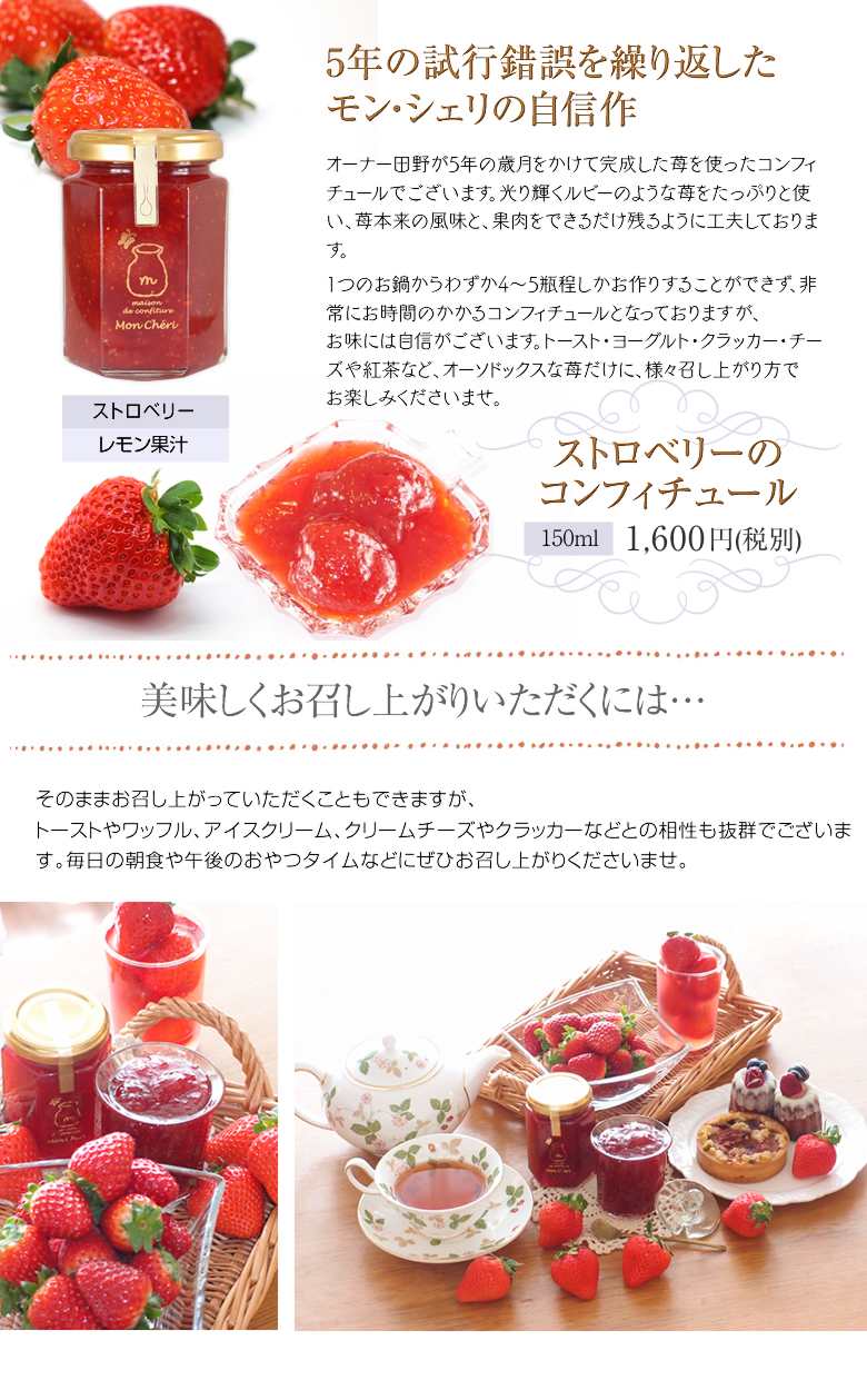 1つのお鍋で、わずか4〜5瓶しかとれない、こだわりの素材をふんだんに使ったモン・シェリ ナンバーワンの自信作です。光り輝くルビーのような苺をたっぷりと使ったここにしかない「オンリーワン」をぜひ、ご賞味下さいませ。